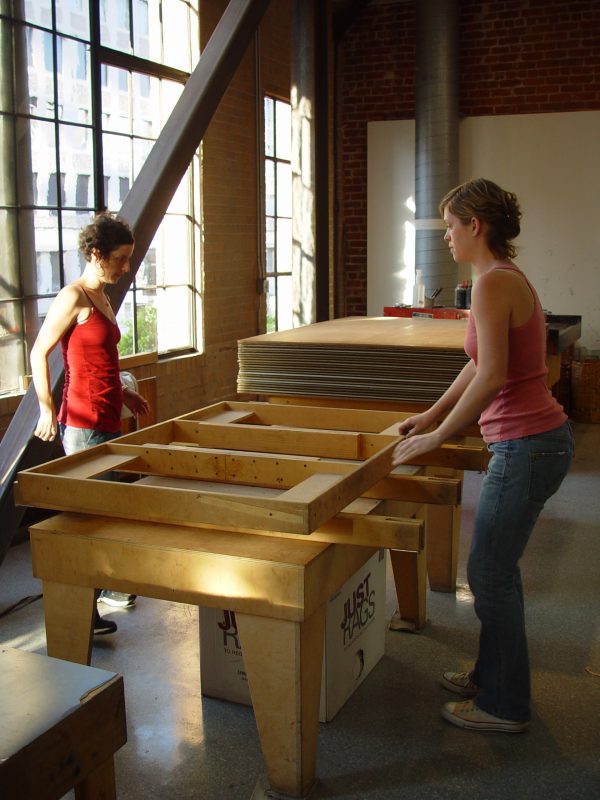 • Construct or buy two sturdy low tables, at least the size of the prints you will be drying. One table stores the dryer. When it is loaded or unloaded the cardboard sheets are restacked on the other table.