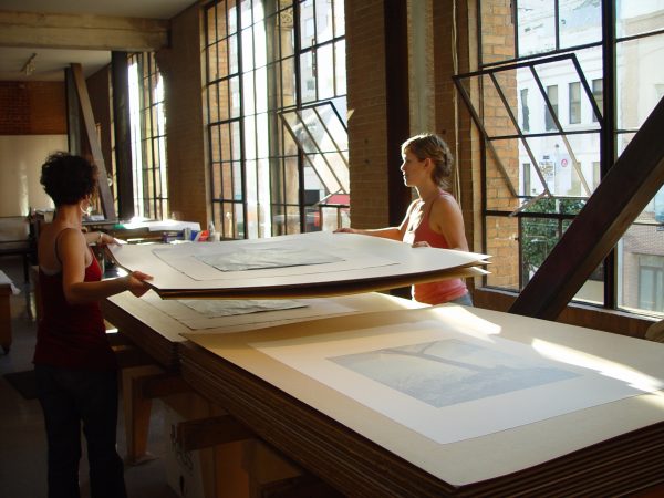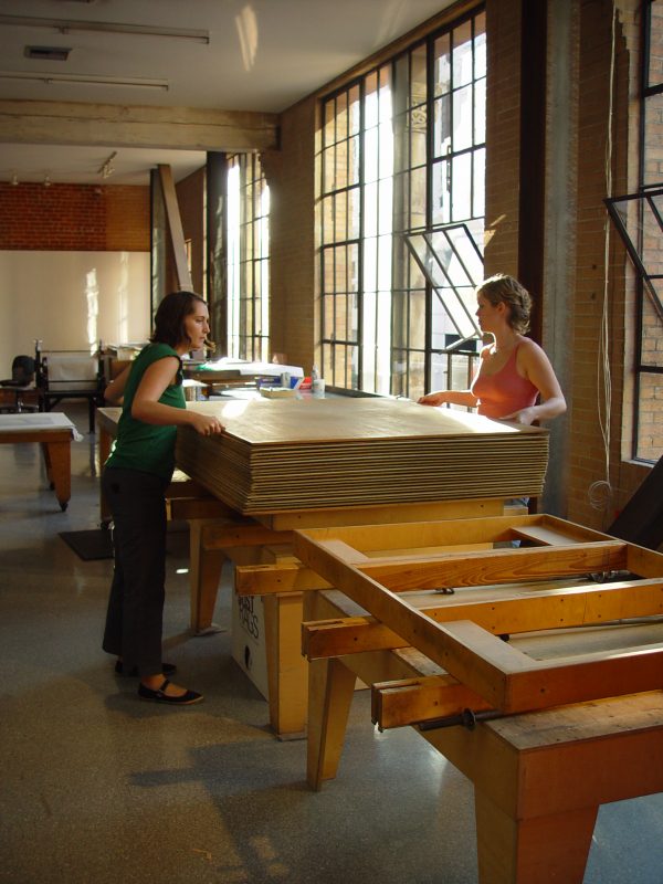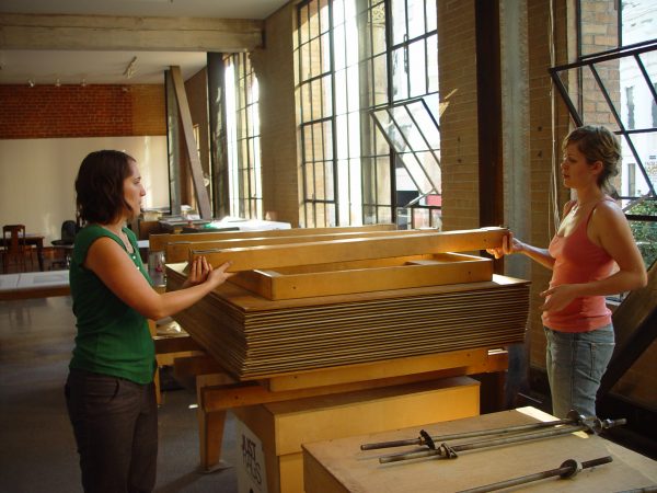 A fast and efficient method of drying prints was developed at Crown Point Press in the early 1970s, and is still in use here now. The Crown Point dryer uses corrugated cardboard stacked alternately with dense smooth cardboard (Upson Board) that can be interleaved with damp prints. The whole stack is then put under pressure and hot air is forced through the corrugations to dry the prints.