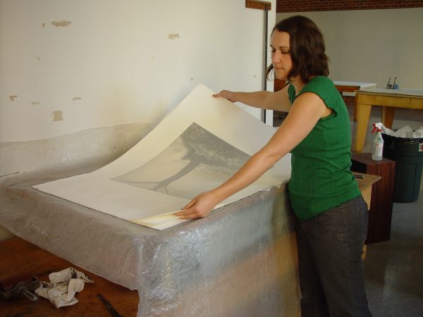 At Crown Point we usually keep a day’s worth of printing in a plastic damp pack and load it into the dryer at the end of the day. If your prints have been air-dried, mist each one, blot it, and wait for it to relax before loading.