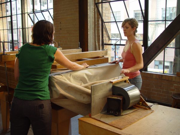• A funnel-shaped cloth bag, preferably made of heavy cotton duck and open at both ends, is required to guide the air from the blower into the stack of cardboard. At Crown Point we found a sailmaker to sew our bag. The smaller end of the bag fits over the blower’s air out–flow opening. Tighten it in place with Velcro strips, rope or bungee cords. The larger opening of the bag must be big enough to fit over the end of the entire stack of cardboard and the plywood sheets in order to feed air from the blower attached to the smaller end of the bag. The warm air circulates through the corrugations and wicks moisture from the prints through the Upson Board and then out through the corrugations of the cardboard.