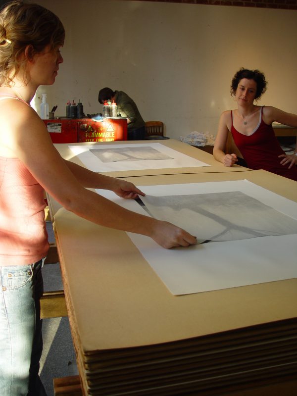 • Cover each print with tissue if the ink is wet. At Crown Point we use snow-white tissue paper which can be purchased in packages of 1,000-24×36 inch sheets from commercial paper suppliers and from some packaging stores. Use sheets of tissue cut to fit the platemark exactly. If your image is larger than the tissue, butt sheets of tissue together to cover it. Overlapping the tissue or leaving its edges on the margins of the prints during drying may cause embossed marks.