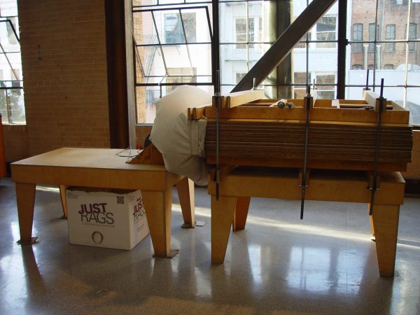 • Obtain two pieces of three-quarter inch plywood the size of your tables. Place them at the bottom and on the top of the cardboard stack.