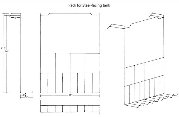 We have a steel rack fabricated with handles to hang over the interior edge of the tank opposite the edge where the pipe is installed. The rack should not be stored in the tank, as the solution will degrade it. After we have prepared a copper plate for steel facing we place it on the rack and lower it into the tank. We then fasten the negative cable from the rectifier to the steel rack.