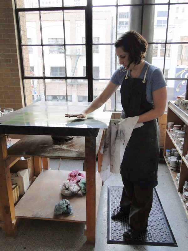 Working at an ergonomic station can really improve the quality of your prints, as you’re able to work very sensitively with your plate. If you’re inking and wiping your plate on a standard, low table you’re forced to hunch over in order to get a good look at your plate. Working on a low surface also makes it easy to exert too much pressure with your tarlatan and take too much ink out of the plate.