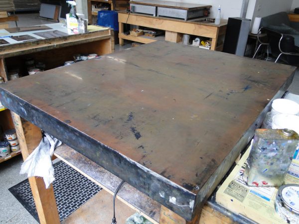 For our tabletops, we’ve used cancelled plates from our artist’s projects. On a shelf below the inking surface we place an ordinary electric hotplate burner, set at medium low. This creates a pleasantly warm surface. If you can’t keep your hand on the surface without feeling like you’ll burn yourself, it’s too hot. This heated surface allows the ink to transfer smoothly and loosens it up a bit for tarlataning and hand wiping.