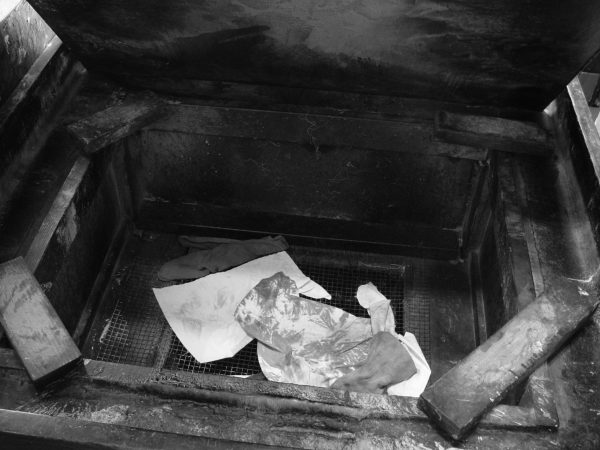 Crown Point Press uses a downdraft table for cleaning plates in the studio. It is a ventilated table that works by pulling air across its surface, then down into a well that is emptied by an exhaust fan installed on the building’s roof. The table is made of wood and can be any size that fits your needs. Consult an electrician about an exhaust fan (with a spark-proof motor) that has the correct capacity for your table size (our fan is 115 volts, 8.7 AMPS, 60 cycles, ½ horsepower).