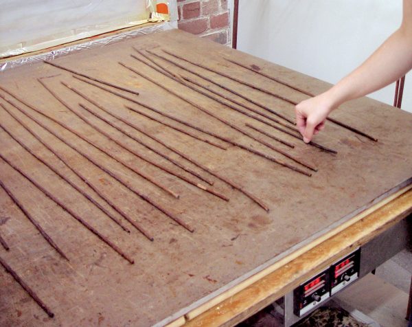 *You will need a bunch of ¼-inch dowels to rest the aquatint plate on so it doesn’t get hotspots and heats evenly. The dowels should be spaced about 1″ apart. If there are too few dowels the plate can bow in the center, causing the aquatint to melt unevenly.